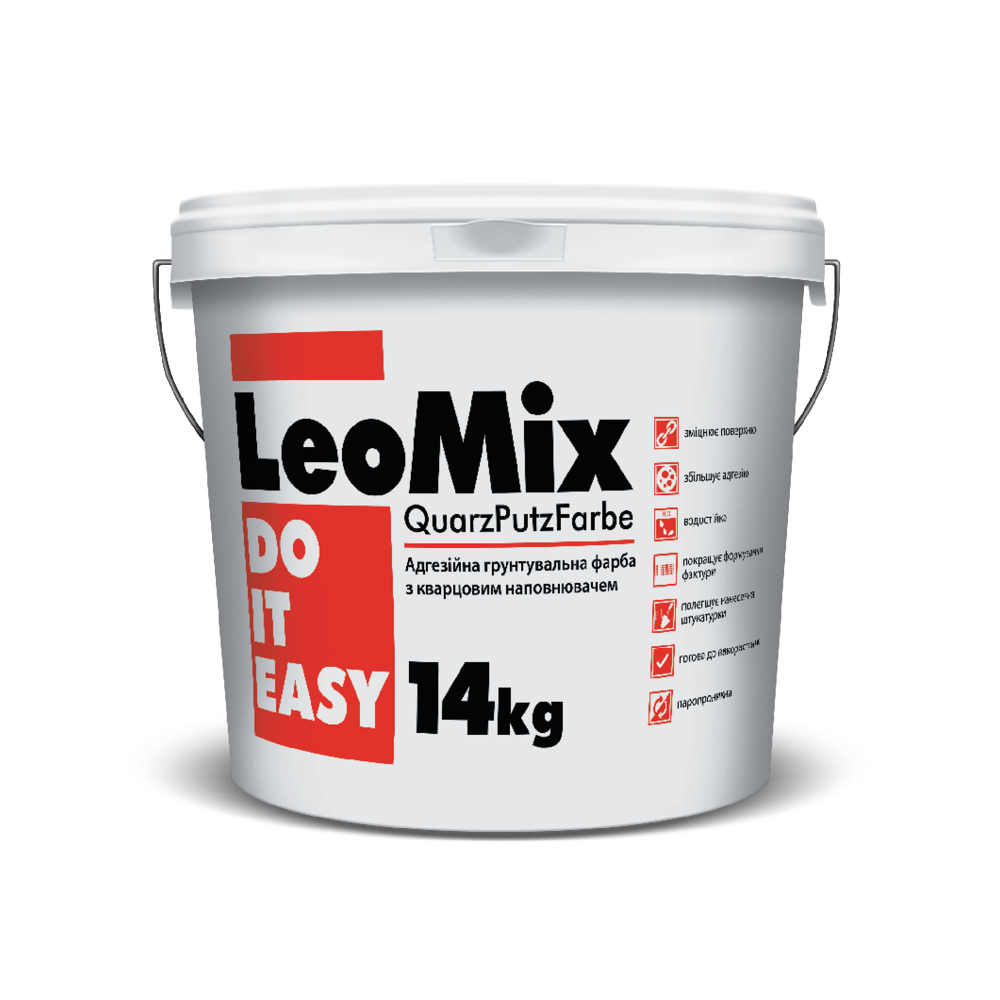 LeoMix QuarzPutzFarbe — готова до використання грунтувальна фарба для підготовки основ з бетону, гіпсу, цементних та цементно-вапняних штукатурок, гіпсокартонних листів, ДСП, ДВП, QSB, OSB перед нанесенням акрилових та мінеральних декоративних штукатурок. Покращує адгезію та запобігає появі плям на поверхні штукатурок, зумовлених особливостями основ. Після висихання утворює міцне покриття, стійке до атмосферних та механічних впливів. Рекомендовано для консервації незавершених фрагментів фасадів на зимовий період. Виготовляється білого кольору. Тонується за каталогами NCS, Color Harmony, Feromal Color System та інших.