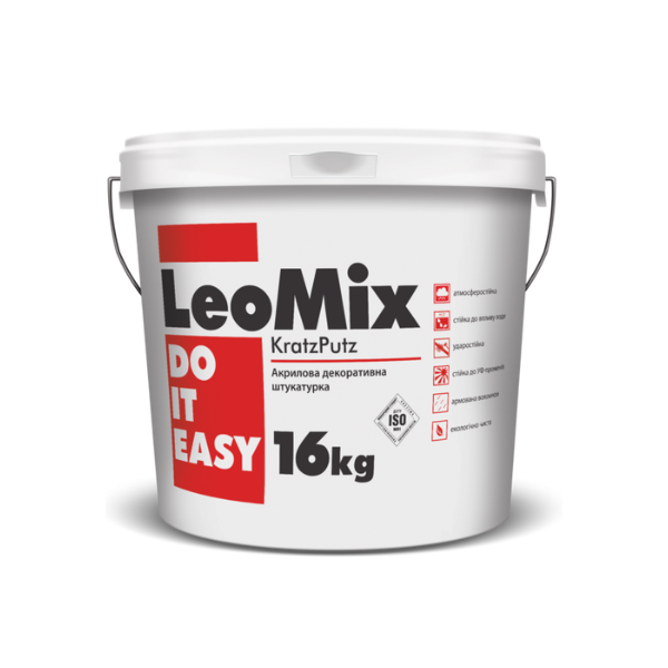 LeoMix KRATZPUTZ — атмосферостійка, армована волокном, готова до використання декоративна штукатурка. Призначена для отримання тонкошарового декоративного покриття типу «шуба» з розміром зерна 1,0; 1,5; 2,0 чи 2,5 мм при влаштуванні систем теплоізоляції з використанням плит EPS, а також основах, виконаних з бетону, цементних та цементно-вапняних штукатурок, гіпсокартонних плит. Виготовляється білого кольору. Тонується за каталогами NCS, Feromal Color System та інших.