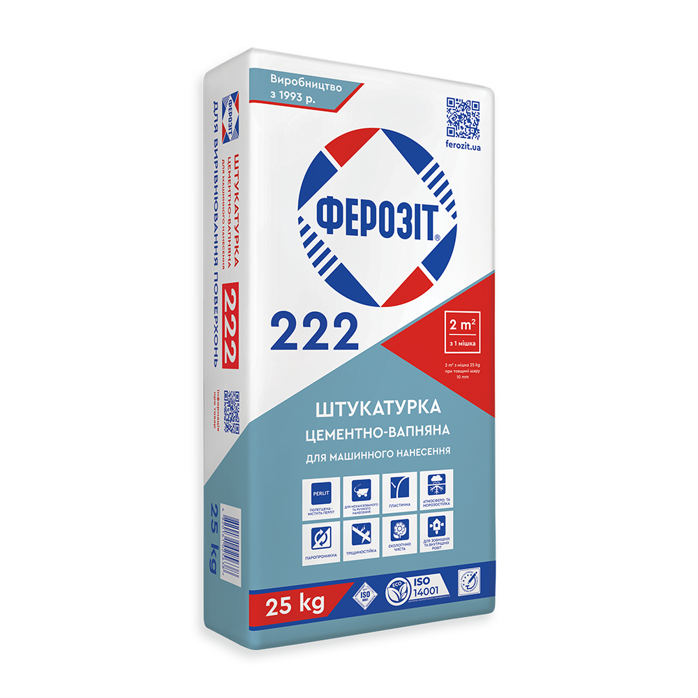 Ферозіт 222 — полімермінеральна модифікована суха суміш на основі високоякісного цементу і вапна з наповнювачами та модифікаторами провідних європейських виробників, призначена для вирівнювання поверхонь з цегли, бетону, газо- та пінобетону, старої штукатурки з використанням штукатурної установки.